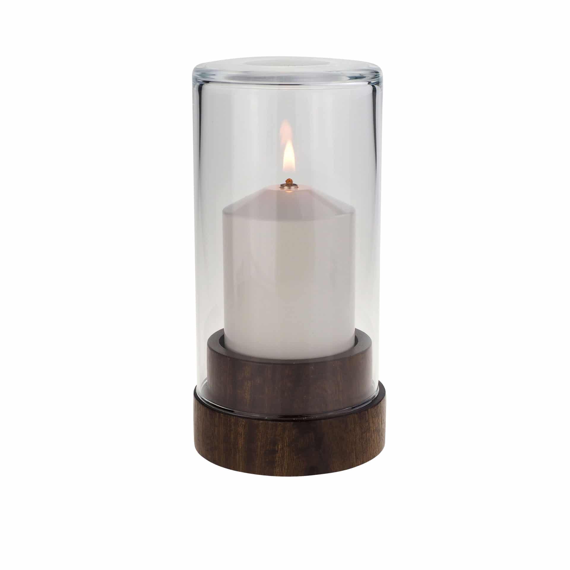 Les éléments – bois et verre – émergent avec la même intensité. Des lignes droites minimalistes et un long temps de combustion rendent ce luminaire convaincant.